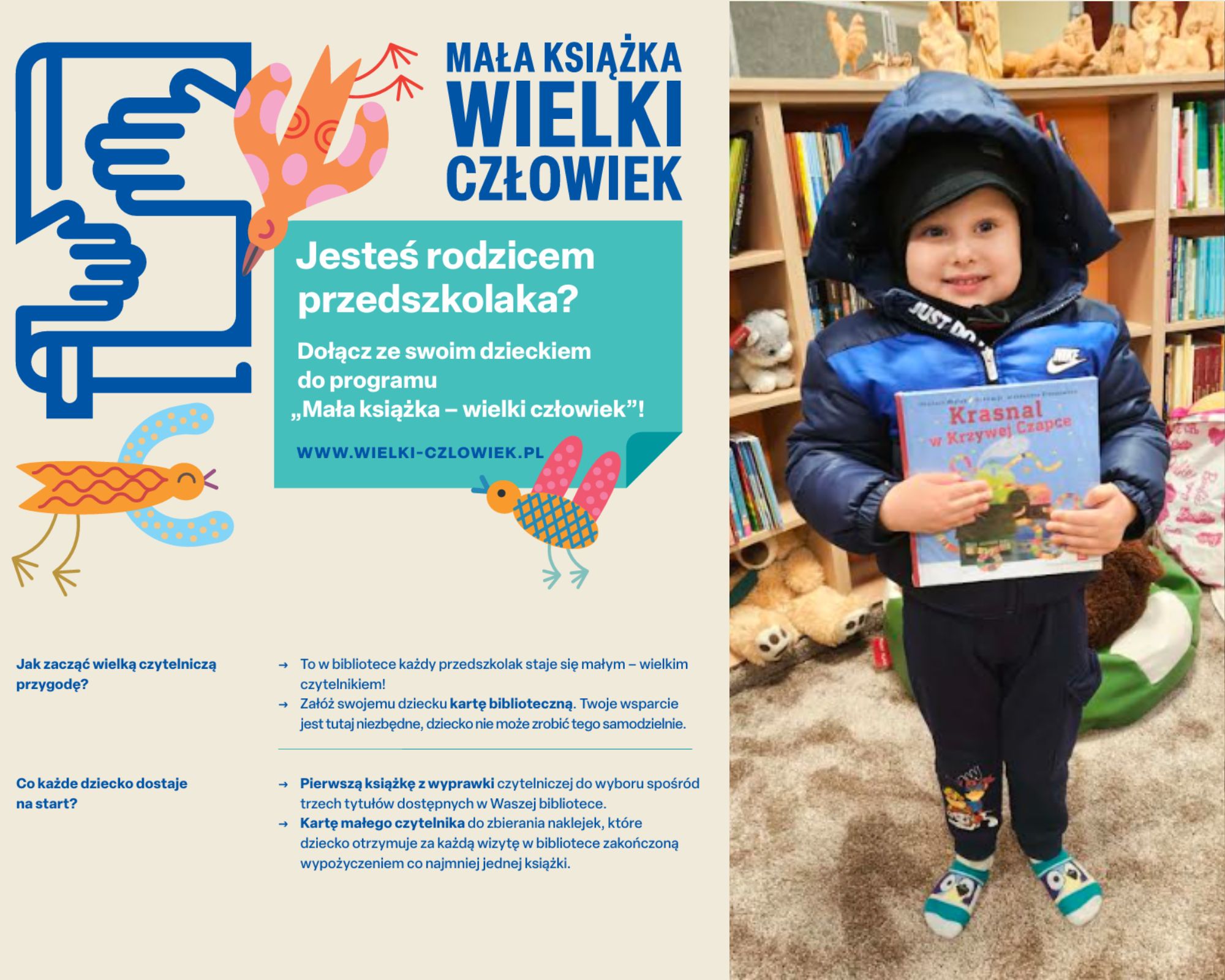Z radością informujemy, że do ogólnopolskiego projektu czytelniczego „Mała książka – wielki człowiek” dołączył kolejny młody czytelnik! W naszej bibliotece w Mokrem powitaliśmy Macieja, który oficjalnie rozpoczął swoją czytelniczą przygodę. Maciej otrzymał w prezencie specjalną wyprawkę czytelniczą, czyli książeczkę na start, która będzie towarzyszyć mu w odkrywaniu świata literatury. To wyjątkowy moment – pierwsza karta w czytelniczym paszporcie i początek pięknej przygody z książkami! Serdecznie zapraszamy wszystkie przedszkolaki oraz ich rodziców do odwiedzenia naszych bibliotek i wzięcia udziału w projekcie.