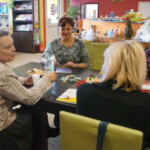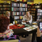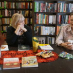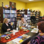 Światowy Dzień Poezji z Lusią Ogińską. Na zdjęciu autorka siedząca przy stole w BPGZ w Mokrem. Obok książki Pani Lusi, w tle regały biblioteczne.